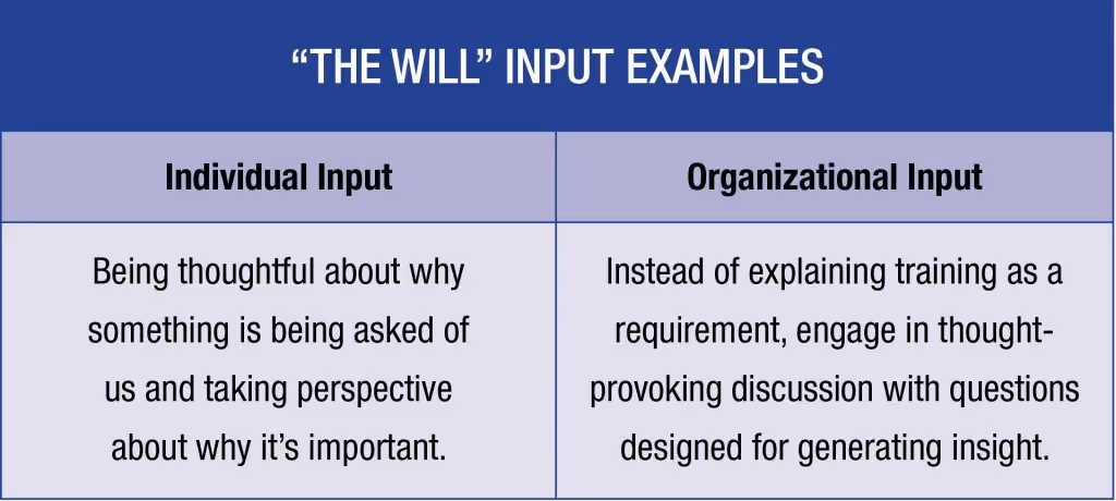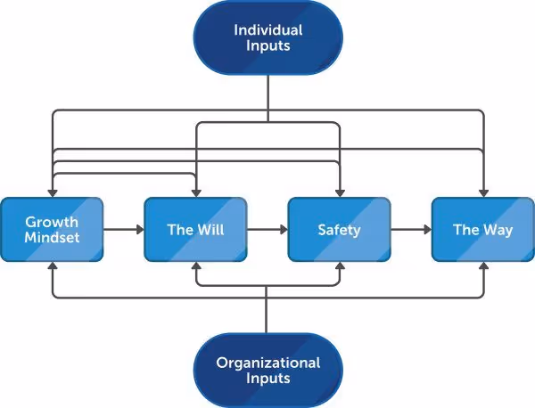 There are four components that create optimal conditions for learning complex tasks in high stakes occupations: a growth mindset, a safe environment, the will, and the way. These are somewhat flexible in delivery order and assessment, and can be influenced (positively, or negatively) by inputs from the individual and the organization. These components are best thought of as a fluid continuum of officer development. Let’s dive in.